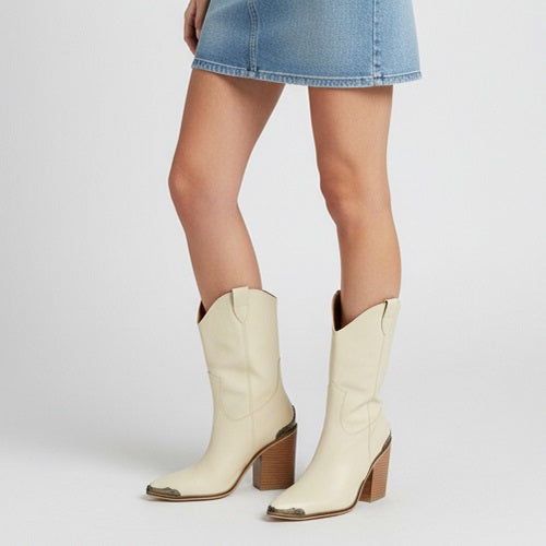 Step out in effortless Western sophistication with these Women’s Cowboy Ankle Boots. Designed with a statement etched metal pointed toe and a chunky heel, they blend bold character with wearable comfort. The perfect booties to add polish and attitude to your everyday look.