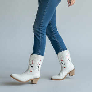 Add a playful western touch to your wardrobe with these cowgirl-inspired mid-calf boots. Crafted from smooth vegan leather, this stylish silhouette features eye-catching poker card embroidery paired with classic western stitching for a bold yet timeless look. Finished with a pointed toe and a stacked block heel, these boots offer all-day comfort without sacrificing style. Perfect for festivals, concerts, or effortlessly elevating your everyday outfits.