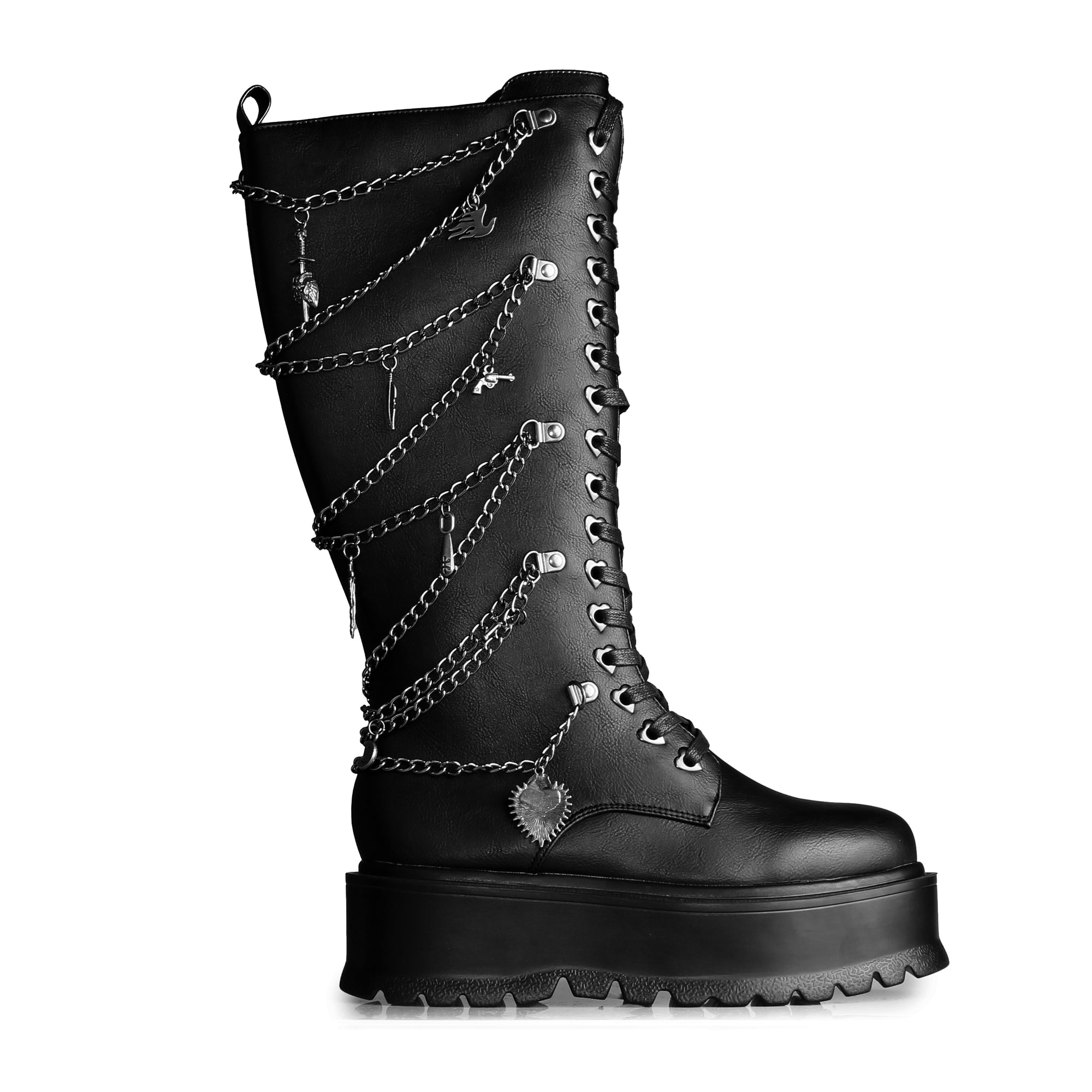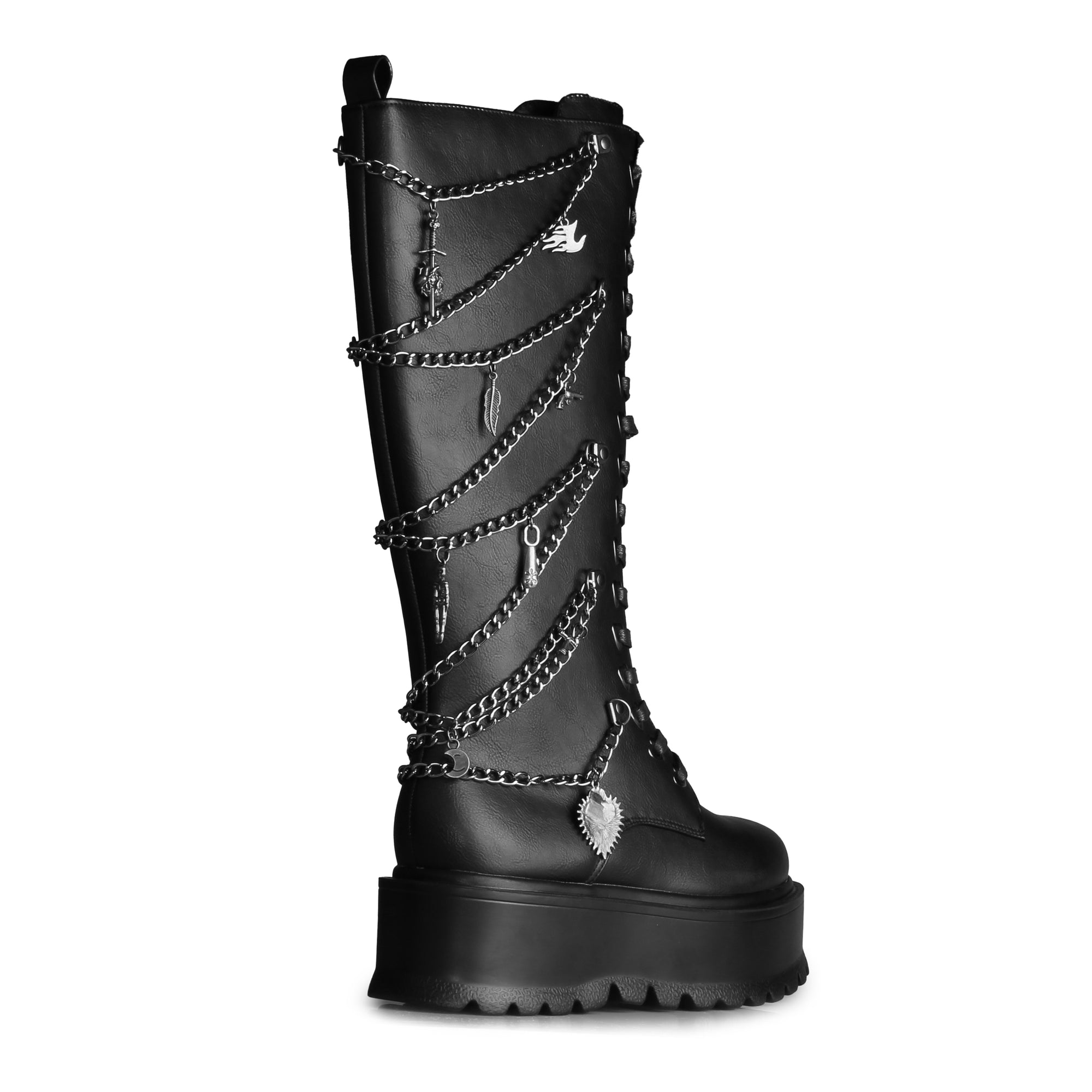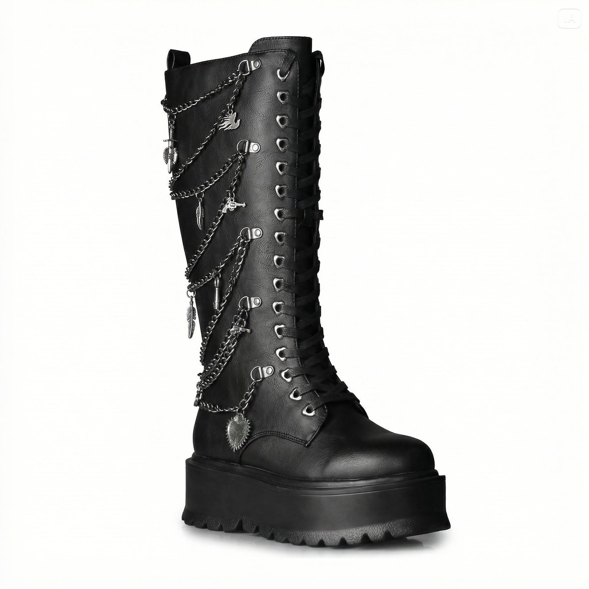 Women's Gothic Punk Knee High Combat Boots with stud, chain and charm detailing